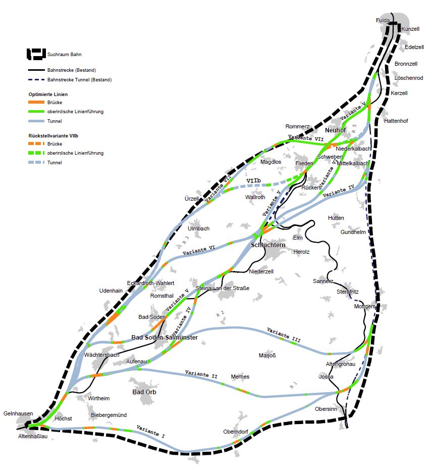 Das betrifft die Variante V, die zwischen Wächtersbach-Innenstadt und Hesseldorf aus einem Tunnel käme, auf einer Brücke das Brachttal überqueren würde und nördlich von Neudorf wieder im Tunnel verschwände, um gleich anschließend beinahe den Kurpark in Bad Soden zu durchqueren.