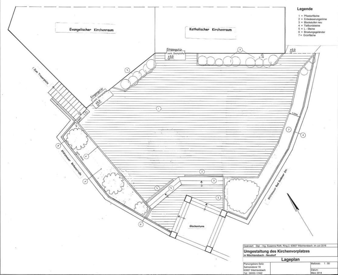 Der größte Teil des Kirchplatzes soll eine neue Pflasterung erhalten. Die Anlage von Blumenrabatten ist ebenfalls vorgesehen. Den Plan können Sie hier anschauen.