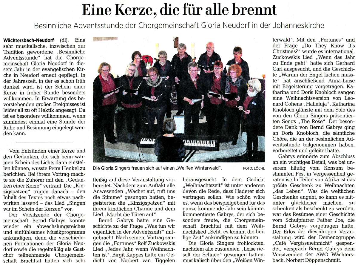 Einer nunmehr langjährigen Tradition folgend, fand auch in der Adventszeit 2019 wieder der Besinnliche Advent der Chorgemeinschaft Gloria Neudorf am Samstag, 14.12.2019, in der evangelischen Johanneskirche in Neudorf statt.