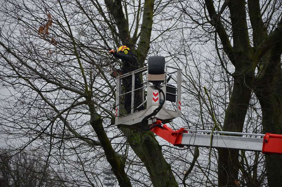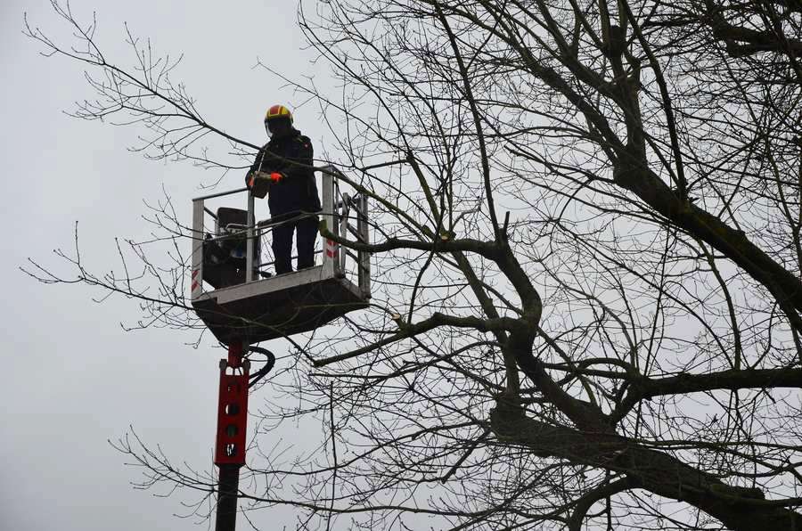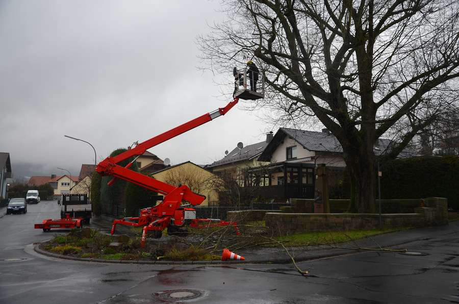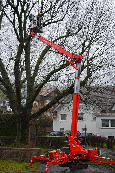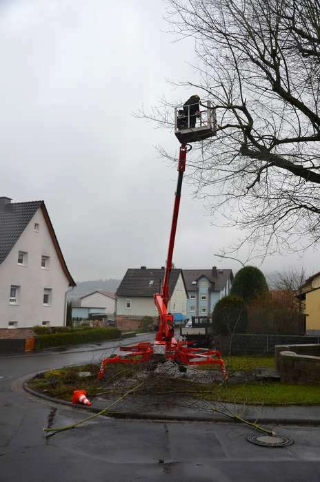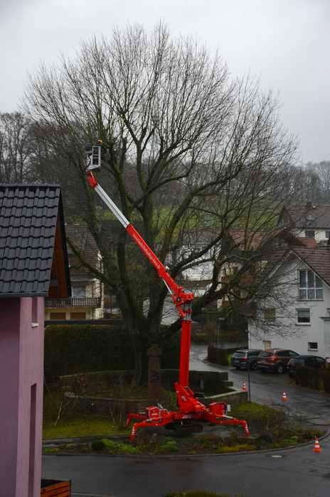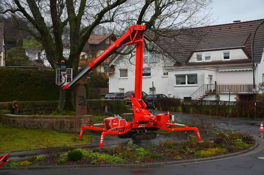 Am 12./13.12.2019 war es dann soweit: Eine Spezialfirma rückte mit schwerem Gerät an. Die beiden eingesetzten Hubsteiger erreichen Höhen von 23 bzw. 25 Metern; bei der Größe der Eiche sind diese Reichhöhen aber auch notwendig.