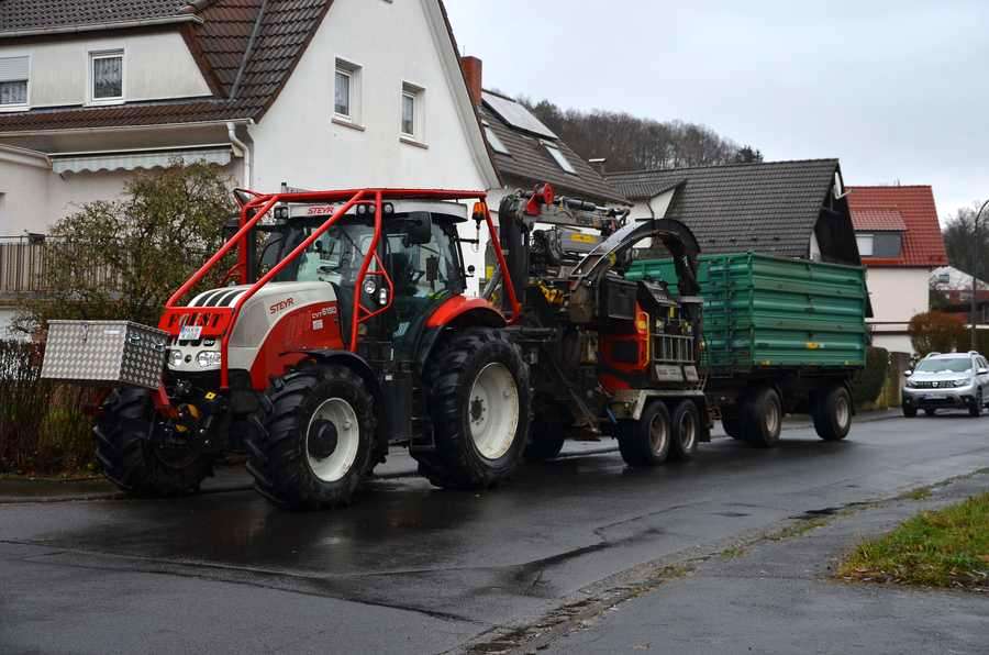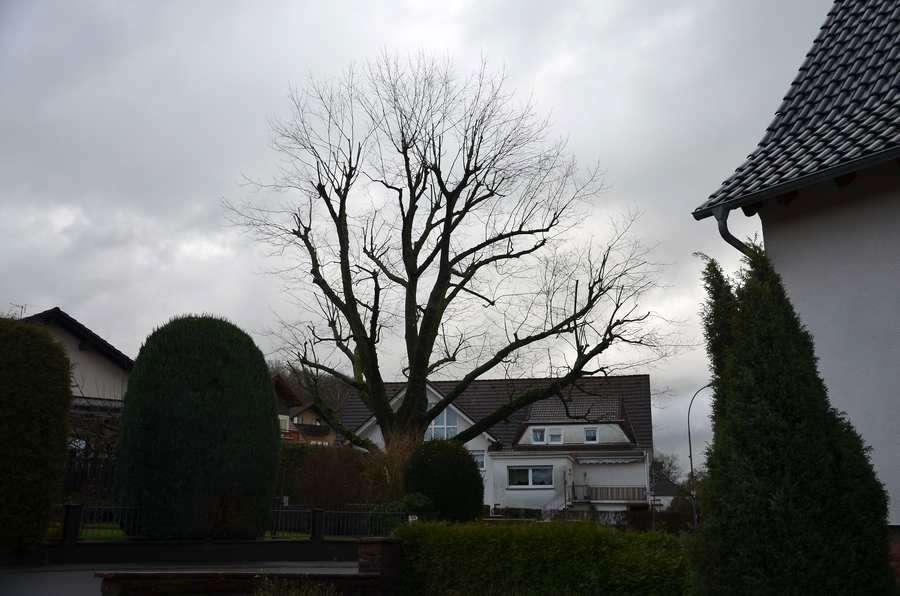 Und die abgeschnittenen Äste wurden gleich im mitgebrachten Häcksler -im wahrsten Sinn- zu Kleinholz verarbeitet. Nach der Behandlung sieht die Eiche ziemlich gerupft aus, aber das war beim letzten Mal auch nicht anders.
