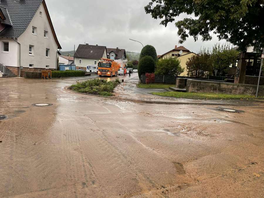 Doch es folgte für Neudorf kein normaler Sonntag. Auf den Straßen waren zur Unterstützung der Aufräumarbeiten Baufahrzeuge und zahlreiche Einsatzfahrzeuge von Feuerwehr, Stadt Wächtersbach und Kanalreinigungsfirmen unterwegs.