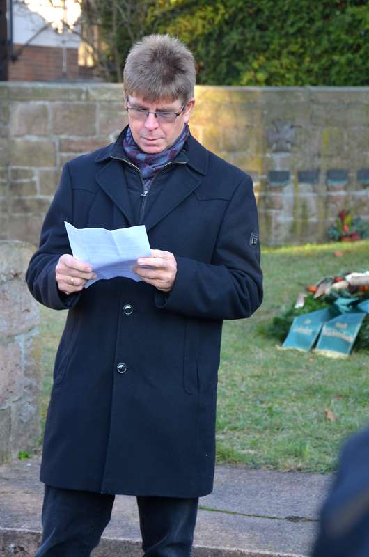 Der in Neudorf wohnhafte Erste Stadtrat Oliver Peetz sprach für die Stadt und verband das Totengedenken mit der deutlichen Mahnung, dass schon einmal eine Partei einfache Antworten auf schwierige Probleme zu haben vorgab, was wenige Jahre später in einem verheerenden Krieg mit Millionen von Toten endete.