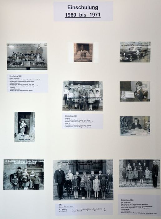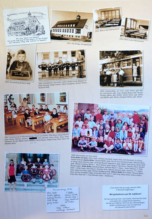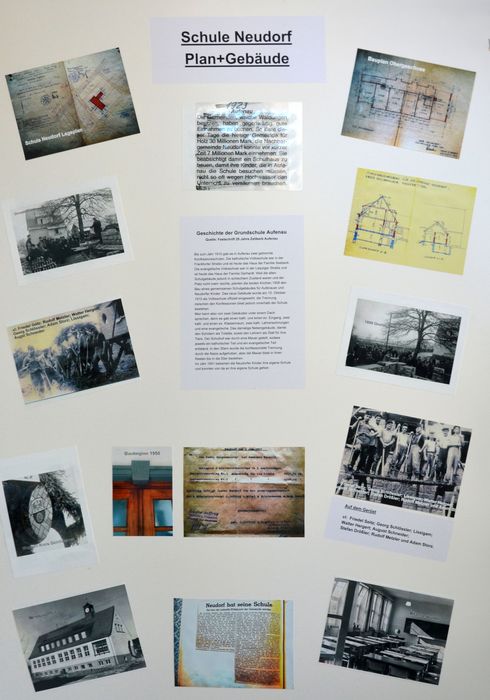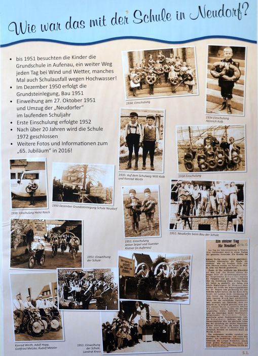 Zur Erinnerung an das 65-jährige Jubiläum hatte der Ortsbeirat Neudorf unter Federführung von Frank Schneider eine Bilderausstellung organisiert. Die ausgestellten Bilder kamen aus dem großen Fundus von mehr als 4.000 Fotos und Dokumenten, der in 2015 im Vorfeld der 650-Jahr-Feier des Dorfes gesammelt worden war. Darunter waren natürlich auch zahlreiche Fotos mit Bezug zur Schule, aus denen jetzt die Ausstellung zusammengestellt wurde.