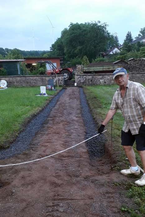 Nachdem die Arbeiten im alten Friedhofsteil abgeschlossen sind, beginnt in Kürze ein weiterer Bauabschnitt im neuen Teil des Friedhofs. Die Stadt Wächtersbach übernimmt wieder die Kosten für das Material und den Minibagger, Unterstützung kommt vom verantwortlichen Rathausmitarbeiter Maximilian Kröll und vom Bauhof der Stadt Wächtersbach.