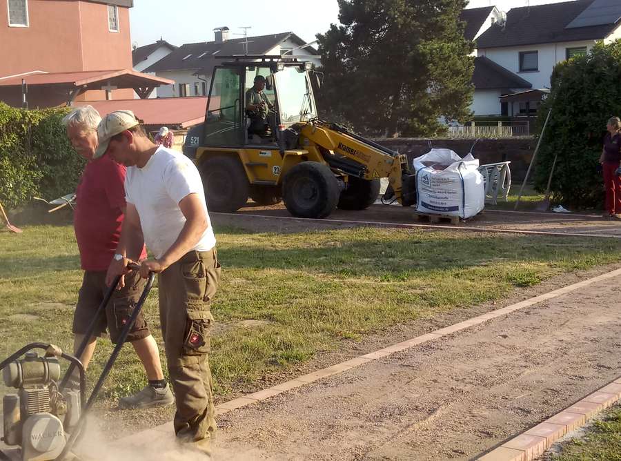 Zahlreiche ehrenamtliche Helfer hatten sich bereit erklärt mitzuarbeiten. So waren Stefan Kistner, Doris Knobloch, Norbert Metzler, Dieter Rasch, Robin Ruck, Frank Schneider und Max Wallner mit den begleitenden Arbeiten beschäftigt – sie kümmerten sich u.a. um den Schottertransport sowie dessen Einbau. Auch der Nieselregen während des Tages konnte die fleißigen Helfer nicht von ihrer Arbeit abhalten.