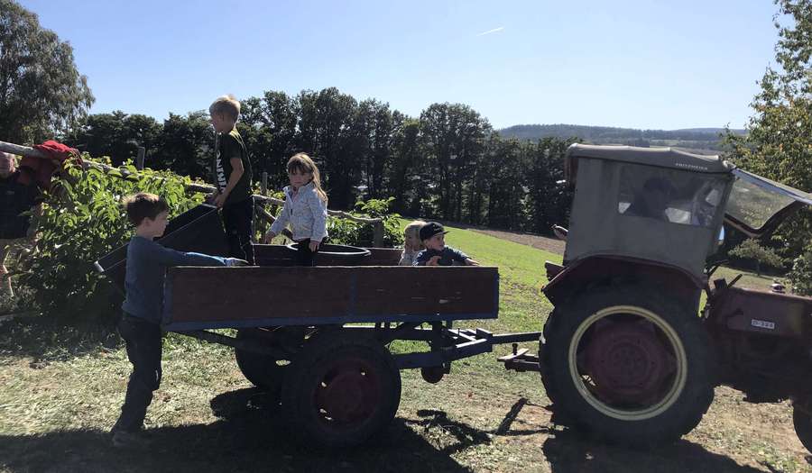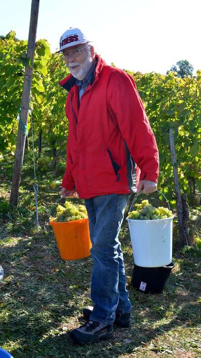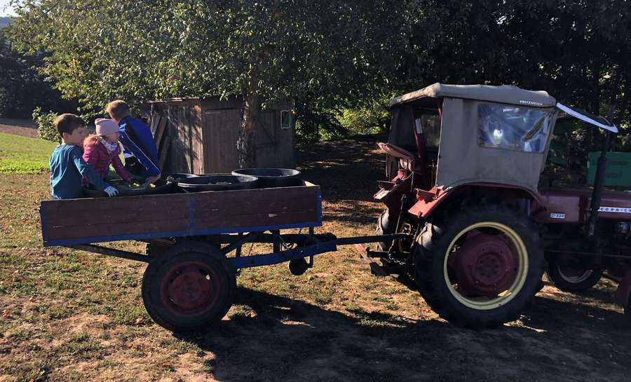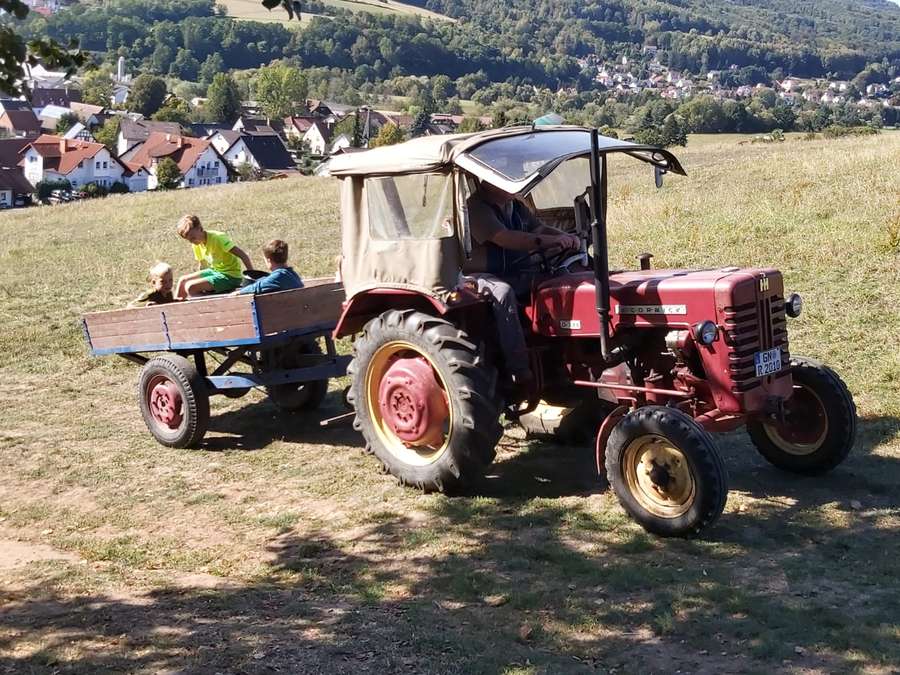 Bei herrlichem Wetter ging die Lese im Weinberg flott voran, obwohl wieder eine große Erntemenge zu bewältigen war. Wilfried Wies, der 2. Vorsitzende des Vereins, sorgte mit seinem Traktor dafür, dass die geernteten Trauben schnell in den nahegelegenen Weinkeller transportiert wurden.