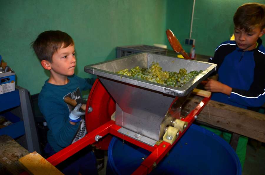 Dort warteten weitere Helfer, darunter auch zwei Jungs, die die Trauben zu Maische zerquetschten.