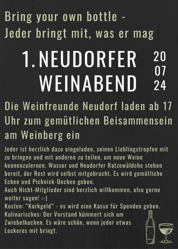 Die Weinfreunde Neudorf eV hatten für den 20.07.2024, ab 17:00 Uhr, zum 1. Neudorfer Weinabend eingeladen, und zwar in einer –für den Verein– neuen Form: Als Bottleparty, in der Jugendsprache auch BYOB genannt.
