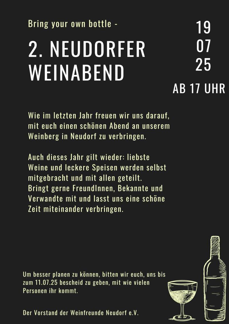Nach der erfolgreichen Premiere im letzten Jahr war klar: Es soll im Jahr 2025 wieder einen Neudorfer Weinabend geben. Die ebenso erfolgreiche Neuauflage gab es am 19.07.2025.